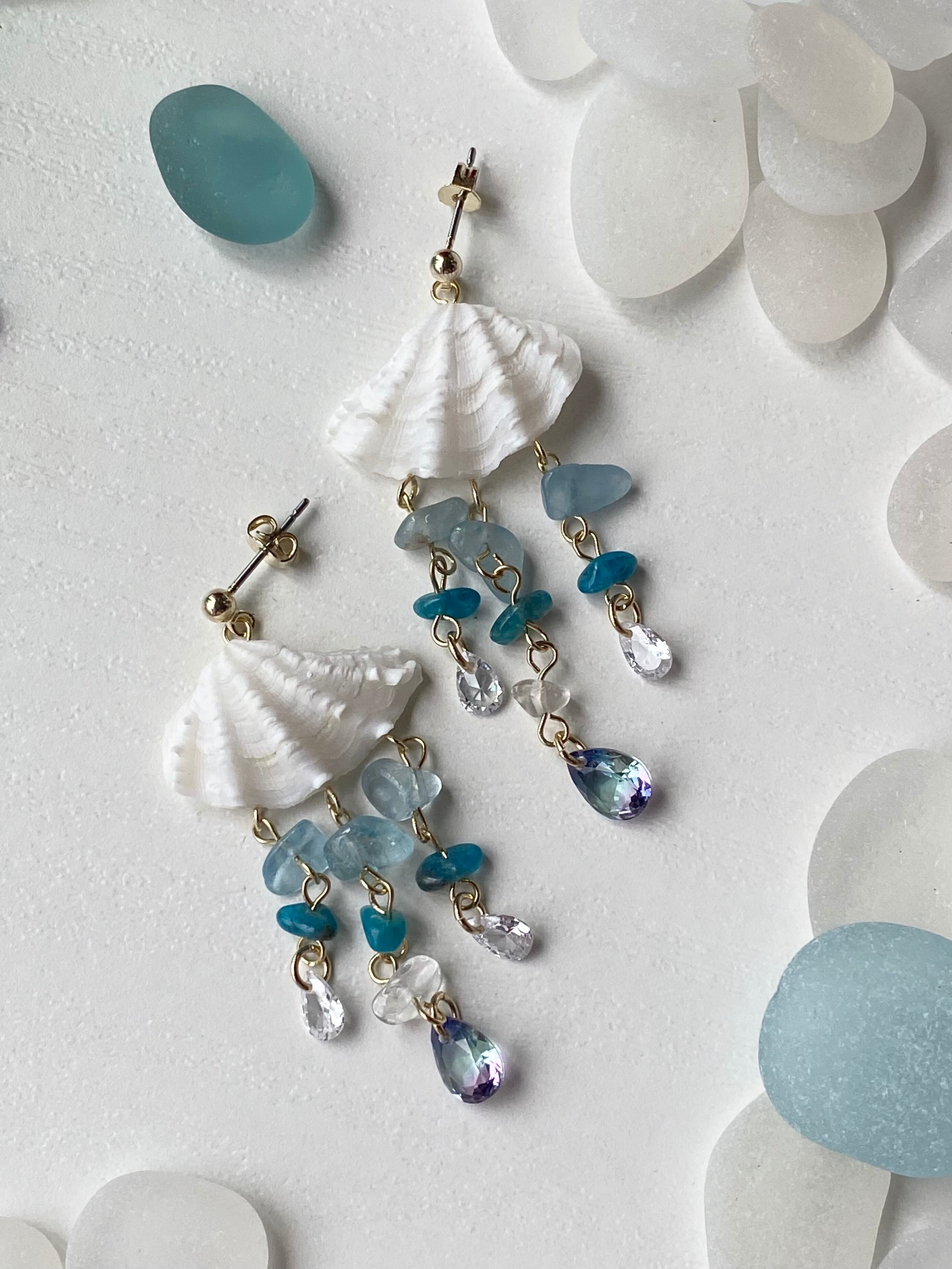 天然石はアクアマリンとカイヤナイトを使用しています。ピアスは、チタン製です。
