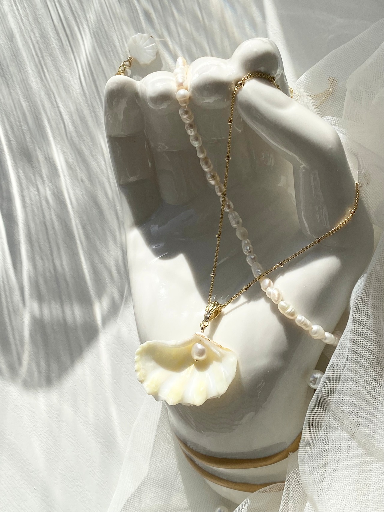 シャコガイと淡水パール ペンダント(ゴールドカラー)