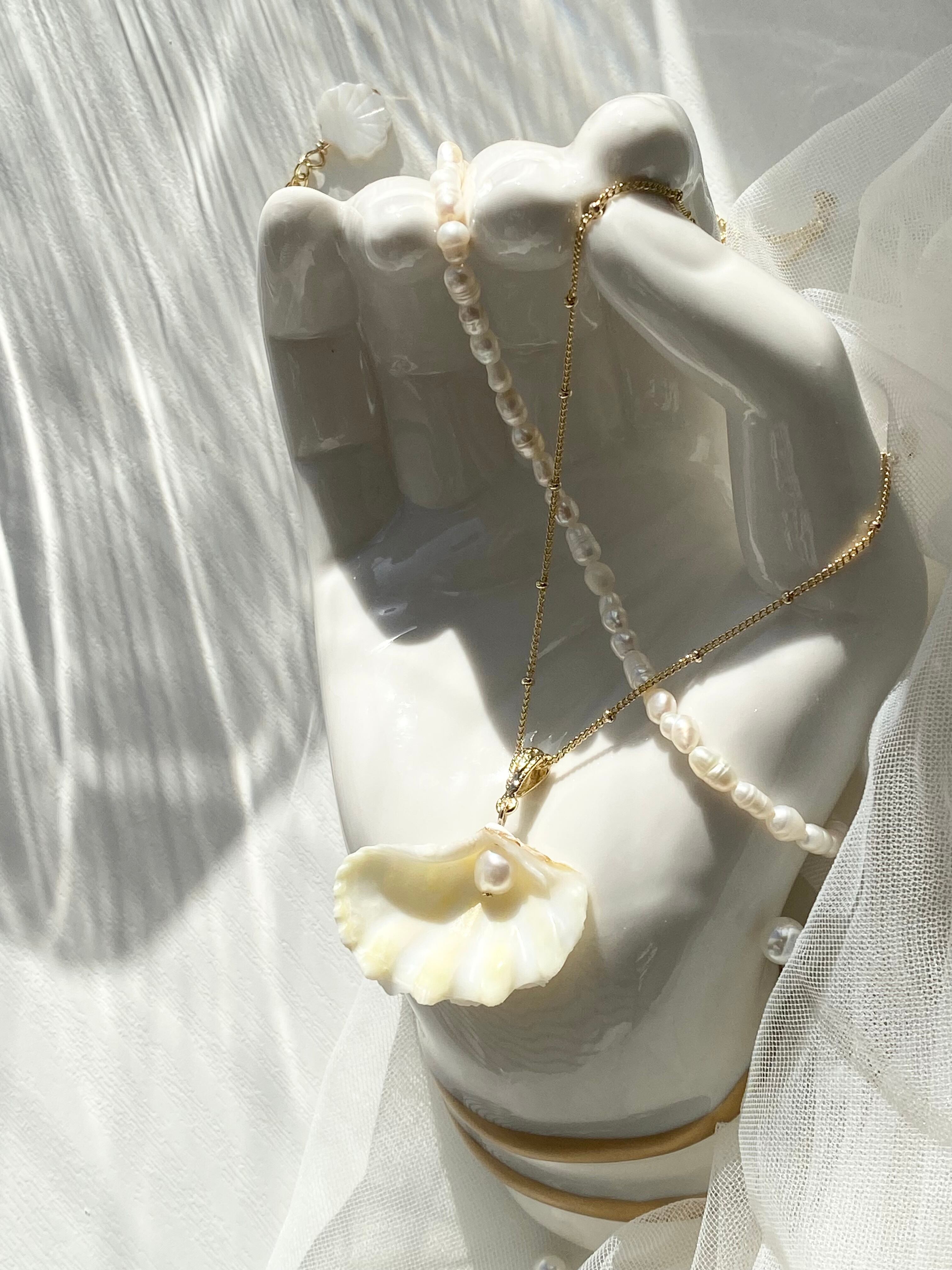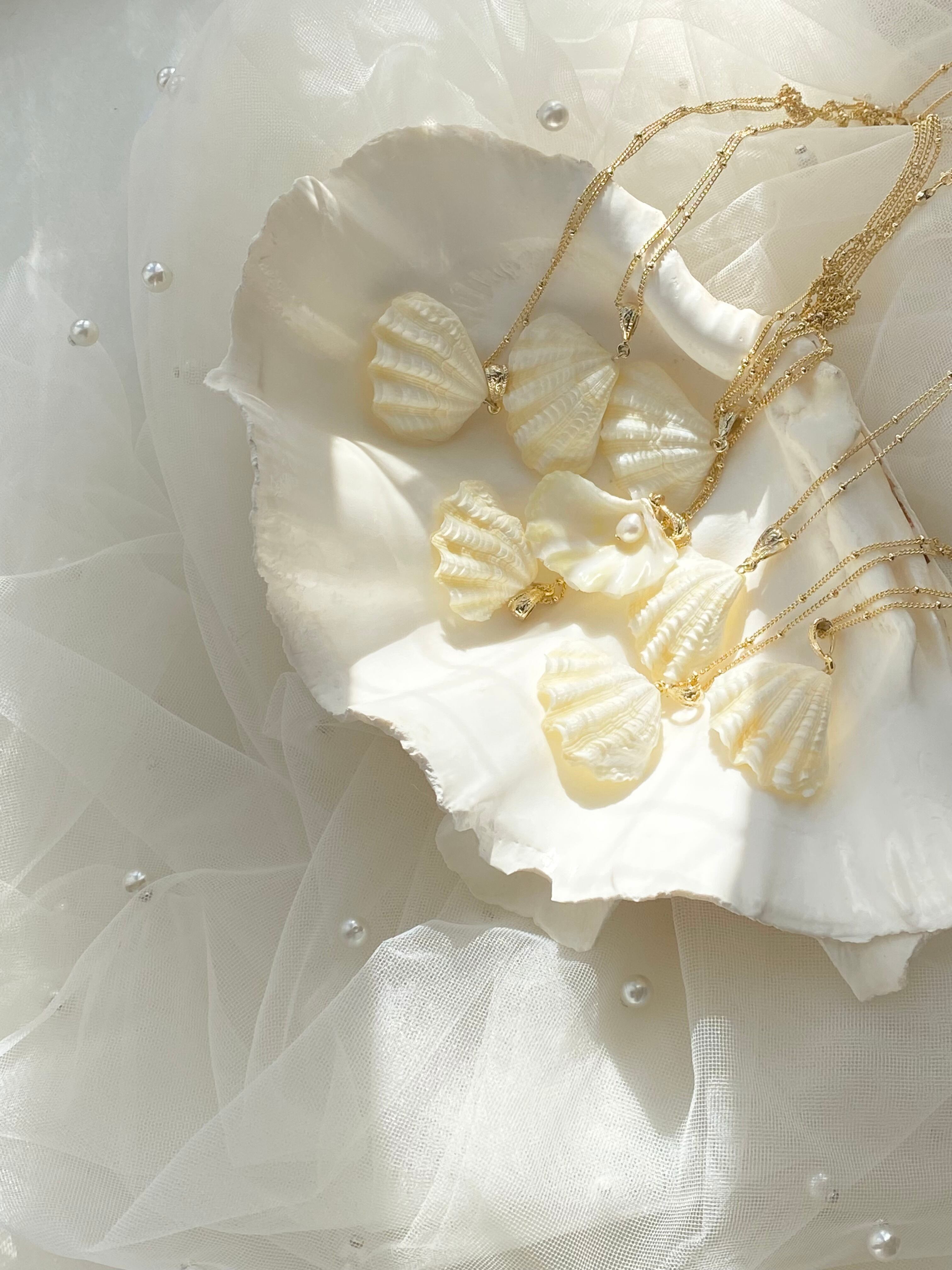 小さなシャコガイをシンプルなペンダントヘッドにしました。裏返っても淡水パールが可愛く見せてくれます。